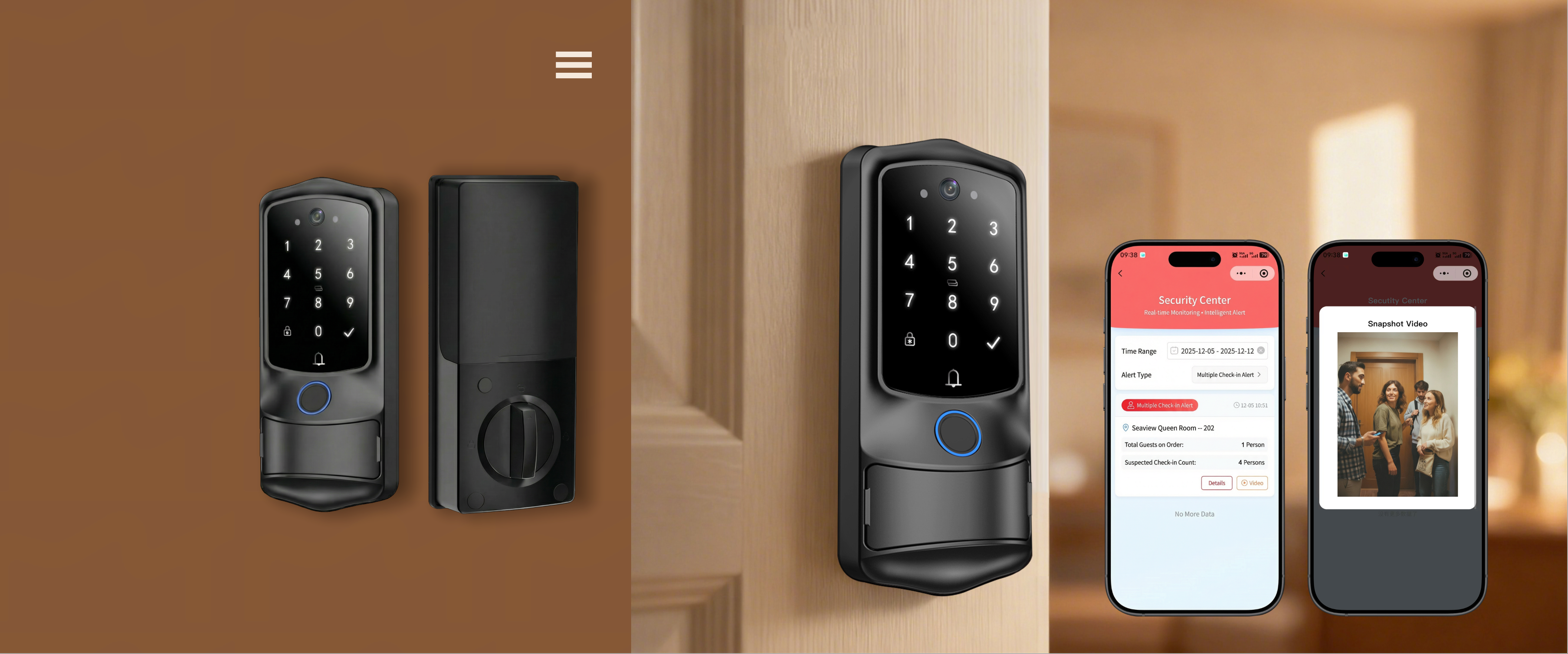 AI-powered security for your vacation rental! Capture entries, count guests in real time, and get instant alerts for over-occupancy. Seamlessly sync with PMS/OTA platforms, enable keyless self-check-in, and install without a gateway. Long-lasting battery + emergency power = hassle-free, compliant hosting.