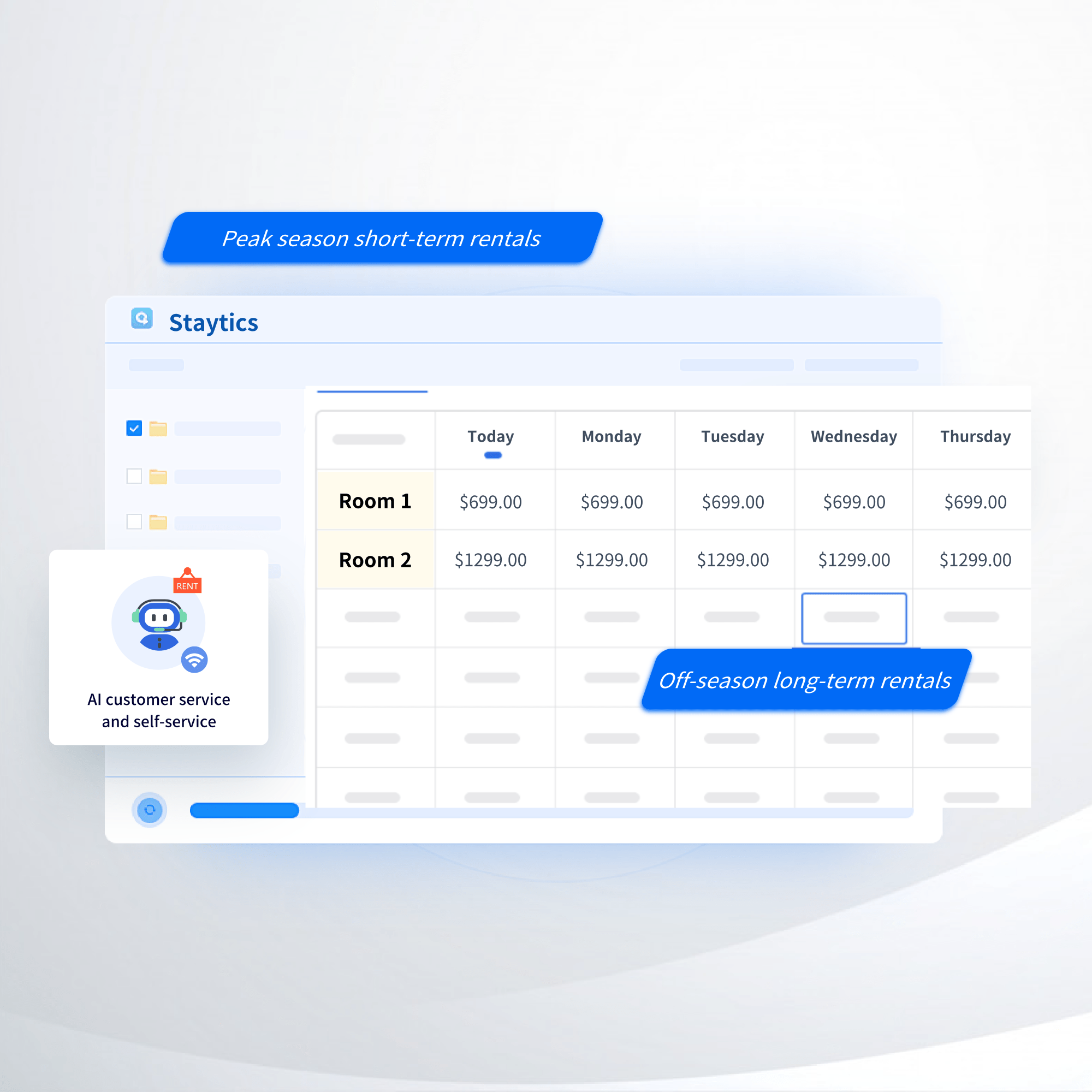 Maximize your earnings: go short-term during peak seasons and long-term during off-seasons. Staytics handles both models seamlessly. One system, one set of hardware—everything you need to adapt.